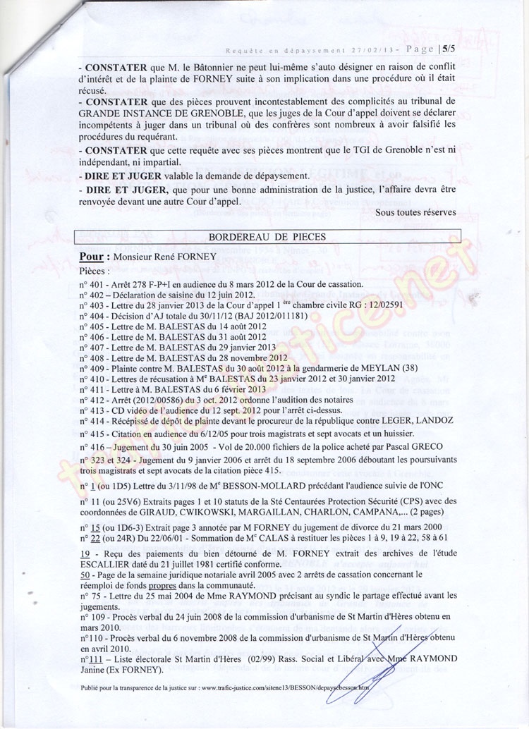 - CONSTATER que des pièces prouvent incontestablement des complicités au tribunal de GRANDE INSTANCE DE GRENOBLE, que les juges de la Cour d'appel doivent se déclarer incompétents à juger dans un tribunal où des confrères sont nombreux à avoir falsifié les procédures du requérant.