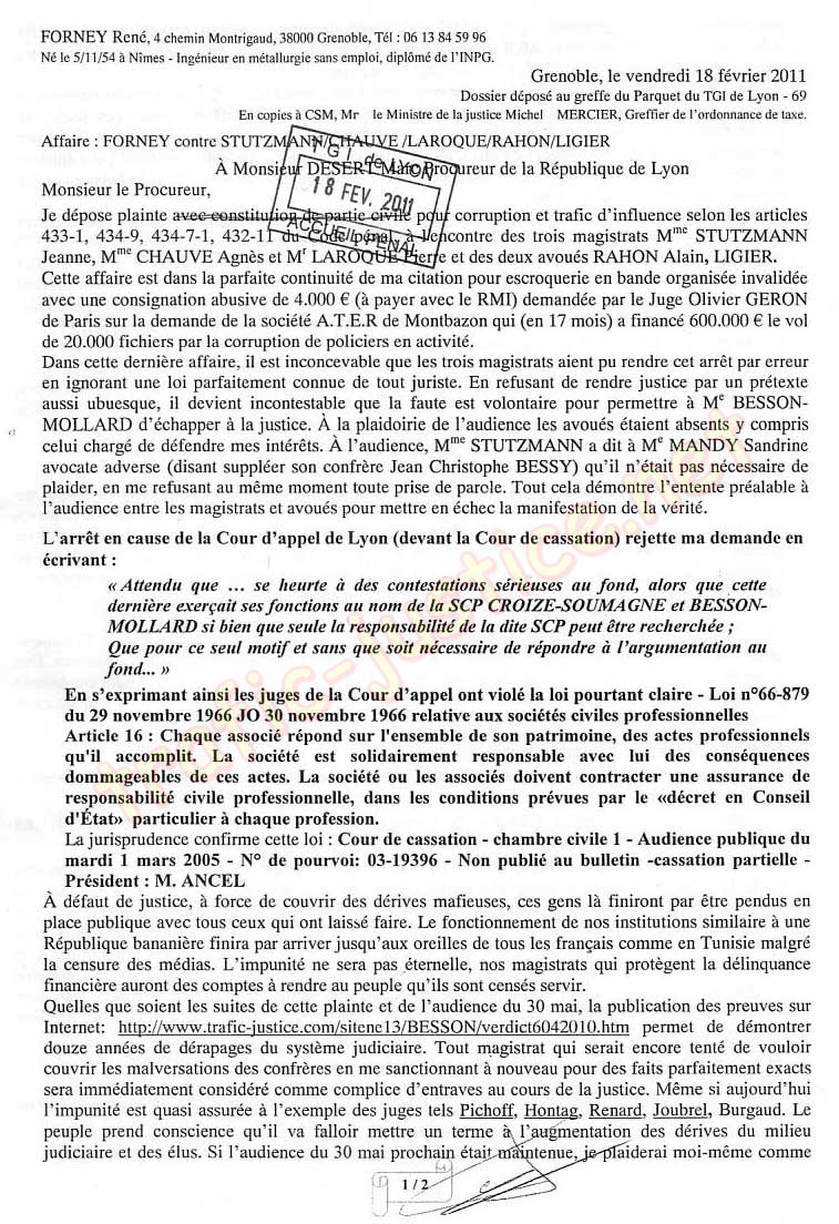 Par cette lettre, je me constitue partie civile suite à des faits continus jusqu'à ce jour. Ma plainte pour escroqueries, trafic d'influence (.) enregistrée au TGI de Lyon (Greffe Pénal) le 18 février 2011. semble avoir eu pour unique suite (entre autres rétorsions) l'appel téléphonique d'un agent de la police interrégionale de Lyon basé à Grenoble, qui m'a simplement demandé si j'étais l'auteur d'un volumineux dossier sans lien entre les faits exposés (J'ai proposé de passer pour des explications). J'extrait (au dessus de ce dossier) les trois pièces 1, 15, 22 qui prouvent que j'ai été jugé sans les pièces de ma défense pour trois jugements successifs . En 13 ans de recours, ces dérives forcément concertées (par un puissant réseau) ont été validées par 200 magistrats (Pour mémoire, 80 magistrats ont validé les dérives du juge Burgaud).