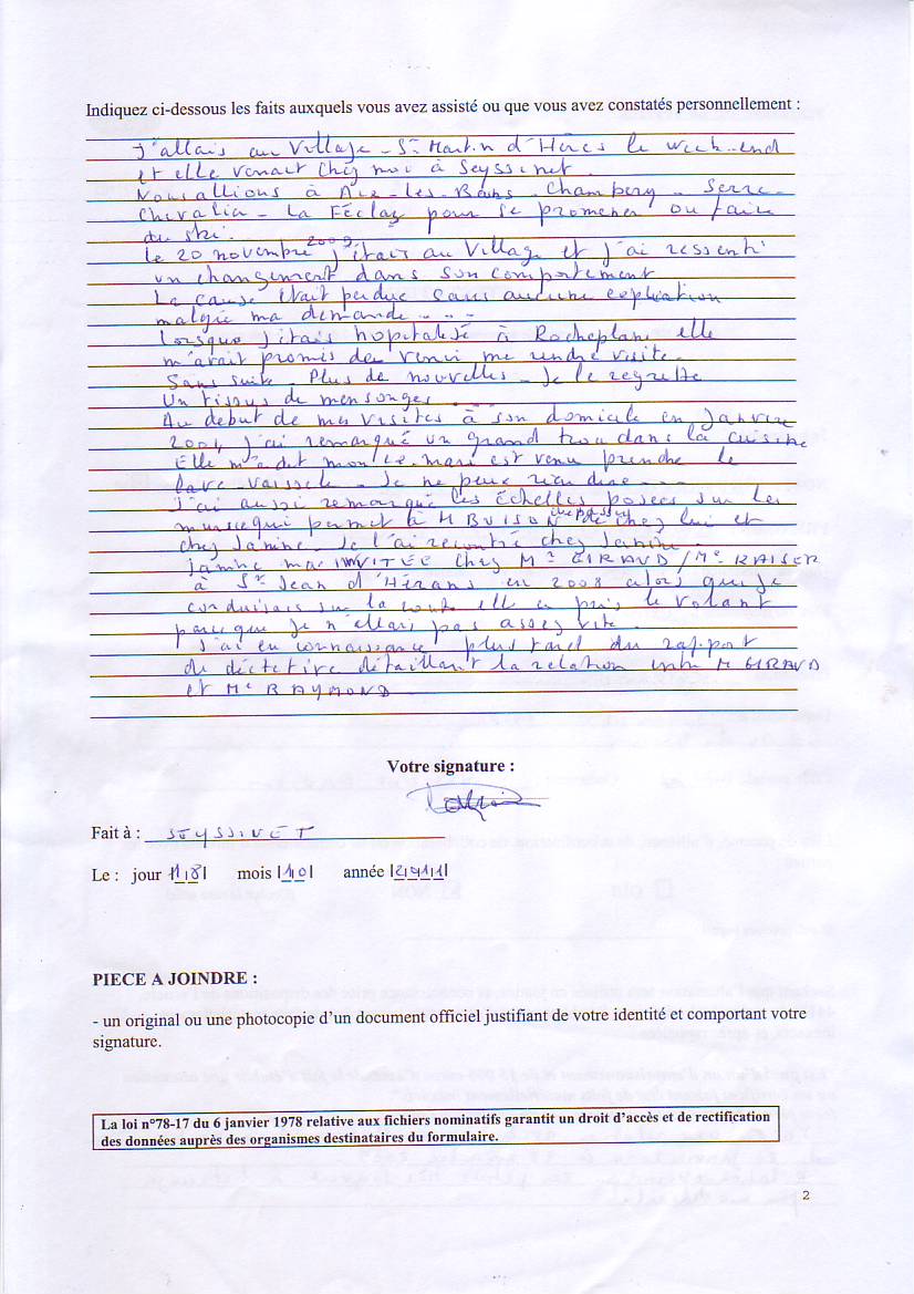 Faits écrits concernant : Des trous en 2004 à la place du mobilier encastré la semaine précédente dans la cuisine de ma maison de St Martin d'Hères ; l'échelle permanente qui permet à M BUISSON Jean-Marc Robert de passer le mur de clôture sans être vu des voisins de la rue ; Mme RAYMOND qui prend le volant parce que son nouveau compagnon ne roule pas assez vite sur les routes sinueuses qui mènent à la maison de campagne de M GIRAUD à St Jean d'Hérans. Un nouveau compagnon qui ignorait tout du rapport sur la relation antérieure de Mme RAYMOND et GIRAUD et qui dit : " un tissu de mensonges "