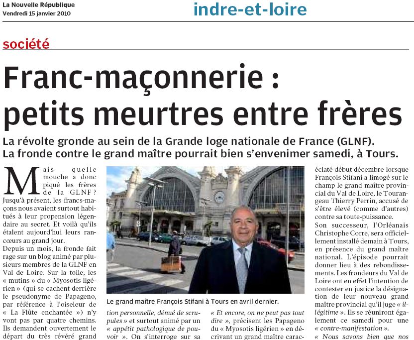Mais quelle mouche a donc piqué les frères de la GLNF ? Jusqu'à présent. les francs-maçons nous avaient surtout habitués à leur propension légendaire au secret. Et voilà qu'ils étalent aujourd'hui leurs rancours au grand jour. Depuis un mois, la fronde fait rage sur un blog animé par plusieurs membres de la GLNF en Val de Loire. Sur la toile, les mutins » duc Myosotis ligérien » (qui se cachent derrière le pseudonyme de Papageno, par référence à l'oiseleur de « La Flûte enchantée ») n'y vont pas par quatre chemins. Ils demandent ouvertement le départ du très révéré grand maître de leur obédience, François Stifani. Rien de moins. L'avocat, qui a été porté il y a deux ans à la tête de la GLNF. est présenté comme un « ennemi de l'intérieur. pétri d'ambi |
