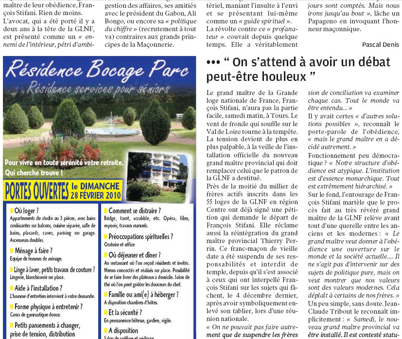 éclaté début décembre lorsque François Stifani a limogé sur le champ le grand maître provincial du Val de Loire, le Tourangeau Thierry Perrin accusé de s'être élevé (comme d'autres) contre sa toute-puissance. Pascal Denis