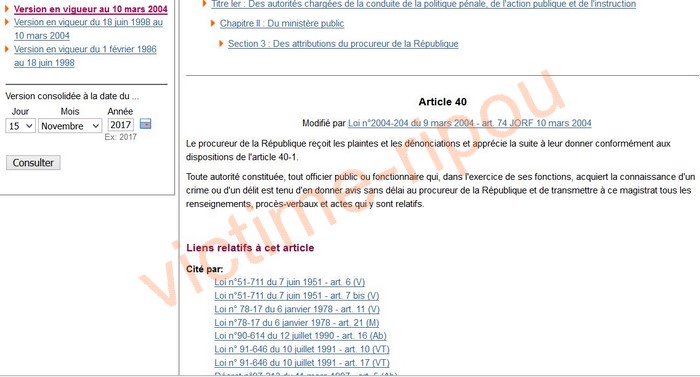 | Article 40 Modifié par Loi n°2004-204 du 9 mars 2004 - art. 74 JORF 10 mars 2004 Le procureur de la République reçoit les plaintes et les dénonciations et apprécie la suite à leur donner conformément aux dispositions de l'article 40-1. « Toute autorité constituée, tout officier public ou fonctionnaire qui, dans l'exercice de ses fonctions, acquiert la connaissance d'un crime ou d'un délit est tenu d'en donner avis sans délai au procureur de la République et de transmettre à ce magistrat tous les renseignements, procès-verbaux et actes qui y sont relatifs. » |