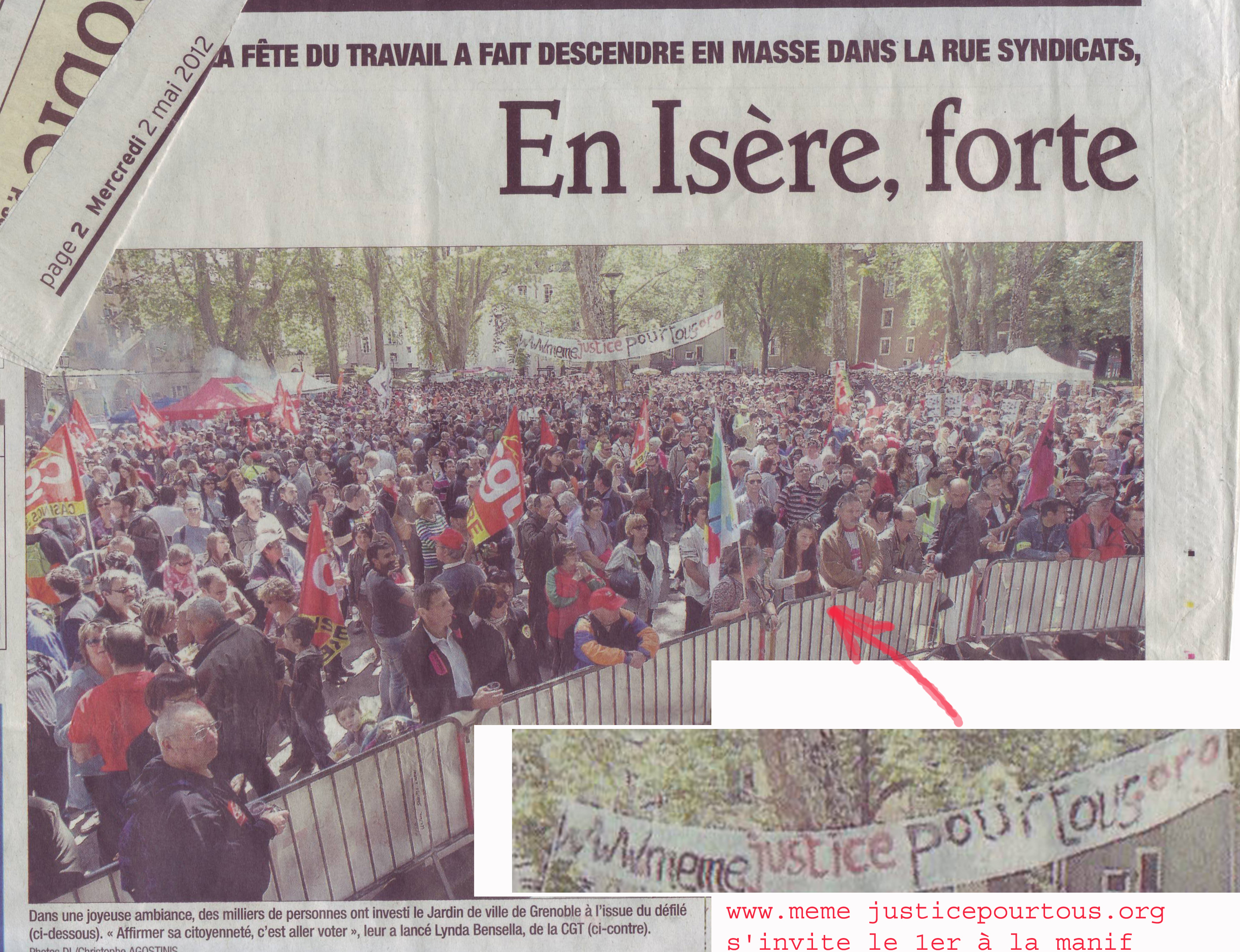 Le défilé du 1er mai 2012 à Grenoble était avec la banderole www.memejusticepourtous.org (très censurée) (Impression PDF)