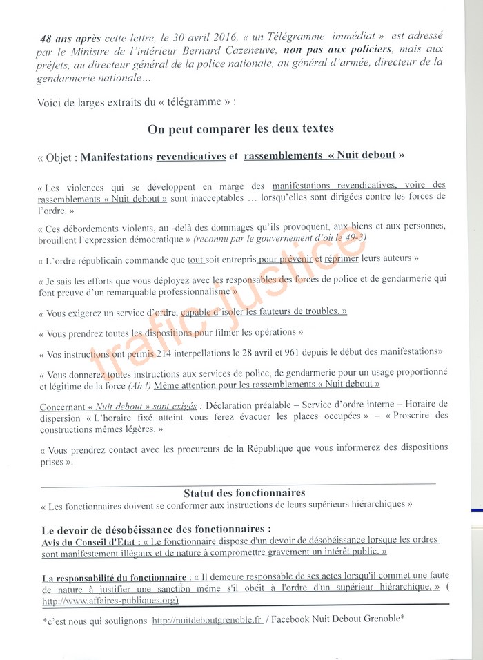 (Recopie du tract ci-dessous) NUIT DEBOUT GRENOBLE A TOUS LES POLICIERS