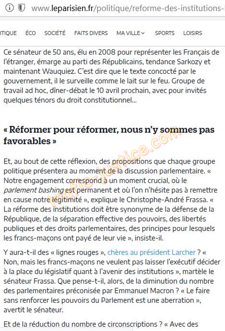 La « fraternité parlementaire » se mobilise sur ce projet cher au chef de l'Etat et contre lequel bataille le président du Sénat, Gérard Larcher. Débat d'idées ou guerre de la communication ? En tout cas, la réforme des institutions , qui sera au menu du Conseil des ministres d'ici à la fin du mois, va s'enrichir d'un nouvel acteur : la franc-maçonnerie. Depuis quelques semaines, les francs-maçons du Parlement, quelque 200 à 250 députés et sénateurs, surtout des sénateurs, des collaborateurs parlementaires ou des hauts fonctionnaires, ont décidé de se saisir du sujet. « Sans arrière-pensée politicienne, de façon transpartisane et toutes obédiences confondues », assure Christophe-André Frassa , le nouveau président de la « Fraternelle parlementaire », élu en octobre dernier. Une exception, toutefois, tous ceux défendant des idées racistes ou antisémites y sont interdits. Après la Nouvelle-Calédonie, le patron la « Frapar », comme la dénomment ses membres, a donc choisi cette question sensible et centrale dans la stratégie d'Emmanuel Macron pour remobiliser un cercle de pensée et d'influence assoupi depuis plusieurs années. Ce sénateur de 50 ans, élu en 2008 pour représenter les Français de l'étranger, émarge au parti des Républicains, tendance Sarkozy et maintenant Wauquiez. C'est dire que le texte concocté par le gouvernement, il le surveille comme le lait sur le feu. Groupe de travail ad hoc, dîner-débat le 10 avril prochain, avec pour invités quelques ténors du droit constitutionnel… « Réformer pour réformer, nous n'y sommes pas favorables » Et, au bout de cette réflexion, des propositions que chaque groupe politique présentera au moment de la discussion parlementaire. « Notre engagement correspond à un moment crucial, où le parlement bashing est permanent et où l'on n'hésite pas à remettre en cause notre légitimité », explique le Christophe-André Frassa. « La réforme des institutions doit être synonyme de la défense de la République, de la séparation effective des pouvoirs, des libertés publiques et des droits parlementaires, des principes pour lesquels les francs-maçons ont payé de leur vie », insiste-il. Y aura-t-il des « lignes rouges », chères au président Larcher ? « Non, mais les francs-maçons ne veulent pas laisser l'exécutif décider à la place du législatif quant à l'avenir des institutions », martèle le sénateur Frassa. Que pense-t-il, alors, de la diminution du nombre des parlementaires préconisée par Emmanuel Macron ? « Le faire sans renforcer les pouvoirs du Parlement est une aberration », avertit le sénateur. Et de la réduction du nombre de circonscriptions ? « Avec des circonscriptions qui seraient mécaniquement plus vastes, attention de bien garantir la représentation des territoires », assène-t-il, comme en écho au président du Sénat qui a fait de cet argument son cheval de bataille. « S'il s'agit de réformer pour réformer, nous n'y sommes pas favorables. Ce qui compte c'est l'application d'une telle réforme », prévient encore le patron de la « Fraternelle parlementaire ». Dans quelques mois, les francs-maçons du Parlement se pencheront aussi avec la même vigilance sur les lois de bioéthique . 7 RÉACTIONS runes - le 11 mars 2018 à 9 h 09 meriva - le 09 mars 2018 à 11 h 05 stop-stop - le 09 mars 2018 à 9 h 30 klaus.lulus35tysopdk0k00cg0soks84k0cw08ss - le 09 mars 2018 à 9 h 04 theseint - le 09 mars 2018 à 8 h 38 horizon21443206492 - le 09 mars 2018 à 7 h 40 mediacomtois - le 09 mars 2018 à 7 h 29 © Le Parisien |
