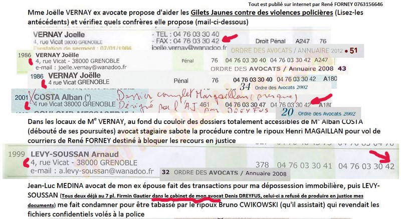 Ci-dessous une compilation d'extraits : d'annuaires d'avocats à plusieurs dates, du jugement du notaire Jean-Guy CUPILLARD, d'une lettre d'un bâtonnier sur le secret entre avocats dans le même cabinet, et, le mail de Joëlle VERNAY pour aider les Gilets Jaunes dans un collectif anti-répressions policières alors que des avocats passés dans son cabinet ont eu un comportement très particulier avec la police !