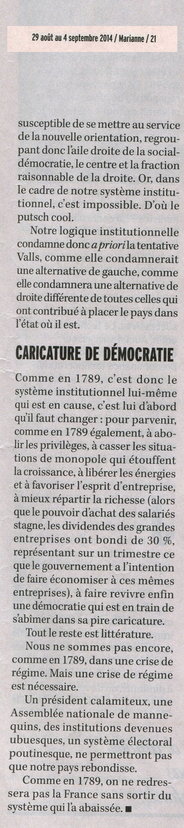 Notre logique institutionnelle condamne donc a priori la tentative Valls, comme elle condamnerait une alternative de gauche, comme elle condamnera une alternative de droite différente de toutes celles qui ont contribué à placer le pays dans l'état où il est.