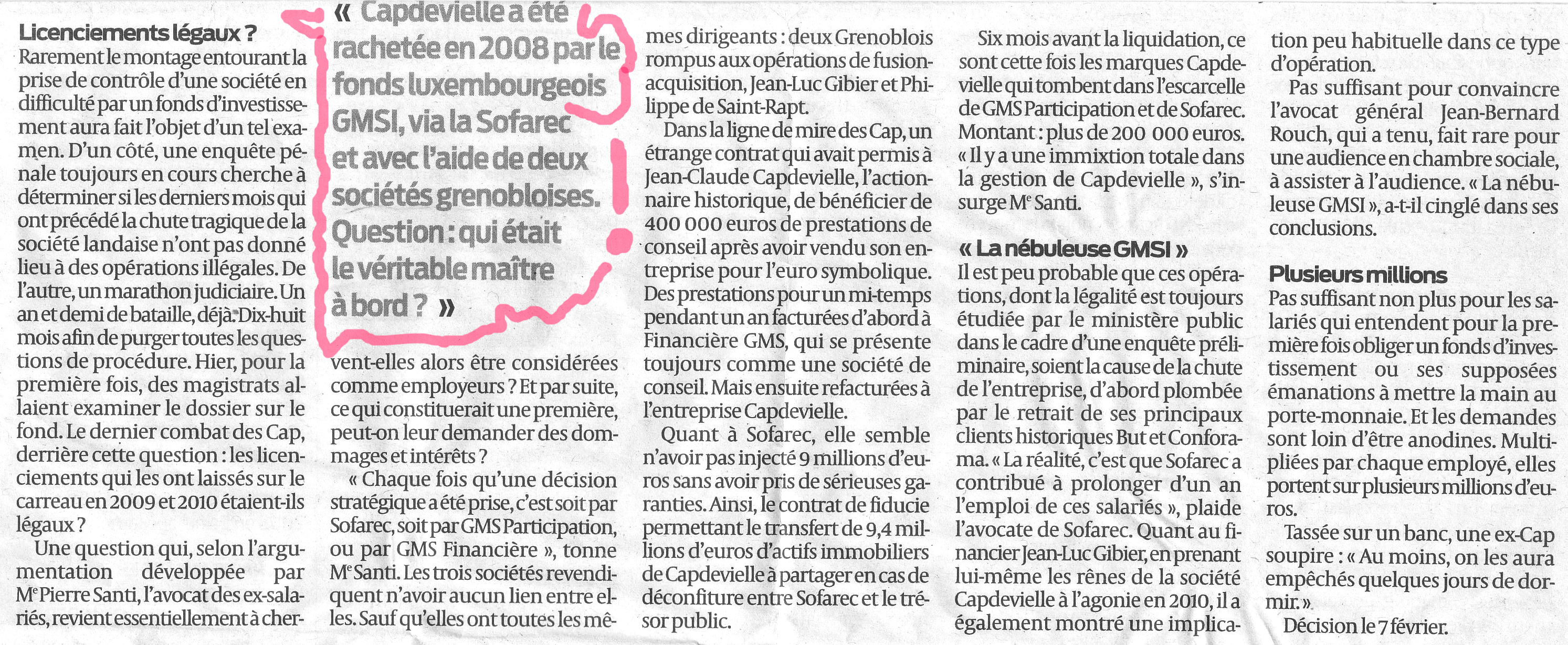 Capdevielle a été rachetée en 2008 parle fonds luxembourgeois GMSI pour l'euro symbolique, via la Sofarec, créée pour l'occasion, et avec l'aide de deux sociétés grenobloises, Financière GMS et GMS Participation. Qui était le véritable maître à bord ? La société GMSI étant immatriculée au Luxembourg et dépendant de fonds basés aux îles Caïmans, elle n'a pas été attaquée parles salariés. Restent les trois autres, soupçonnées d'être les émanations du fonds d'investissement et d'avoir exercé une tutelle opérationnelle à différents niveaux. Peu-