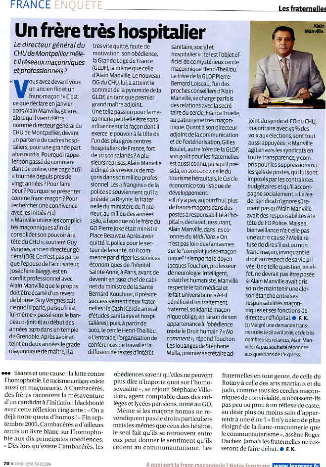 devant vous un ancien flic et un fran-maçon ! c'est ce que déclare en janvier 2005 Alain Manvielle, 56 ans...Manville utilise les complicités maçonniques afin de consolider son pouvoir à la tête du CHU...dans un temple de Grenoble...