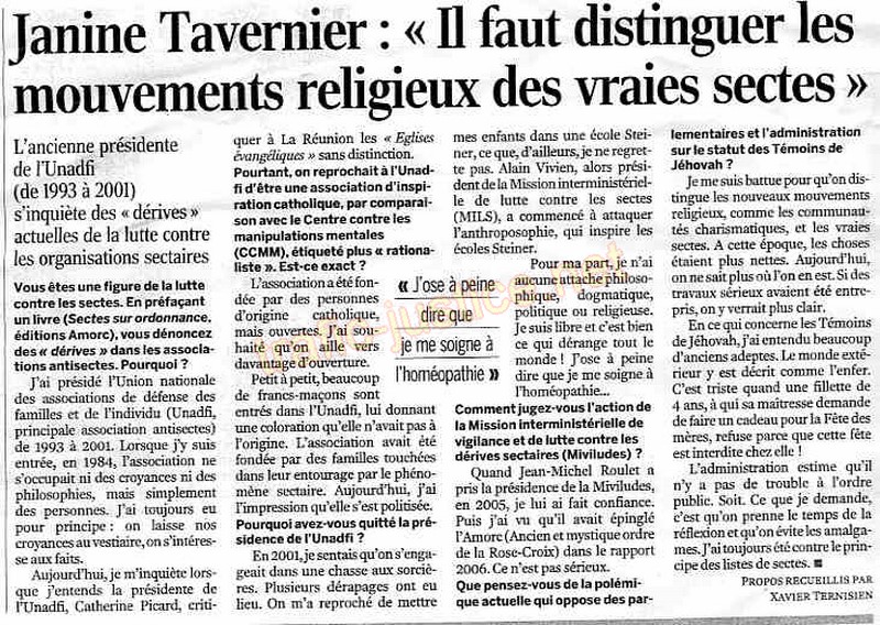 | Texte recopié Janine Tavernier : " Il faut distinguer les mouvements religieux des vraies sectes " |