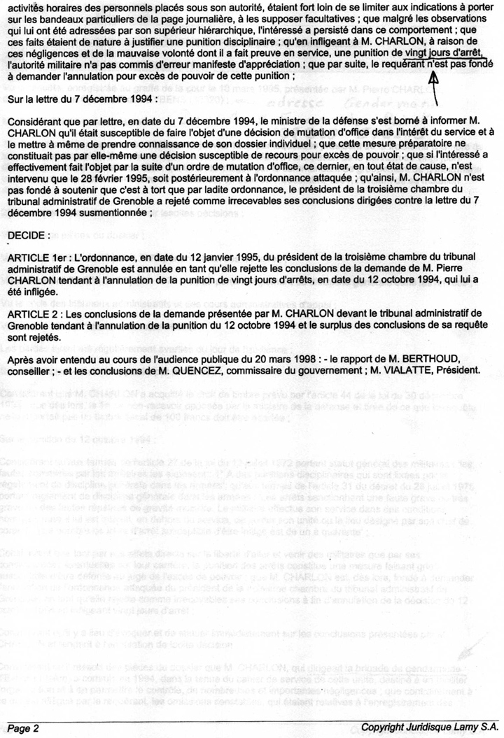 activités horaires des personnels placés sous son autorité, étaient fort loin de se limiter aux indications à porter sur les bandeaux particuliers de la page journalière, à les supposer facultatives ; que malgré les observations qui lui ont été adressées par son supérieur hiérarchique, l'intéressé a persisté dans ce comportement ; que ces faits étaient de nature à justifier une punition disciplinaire ; qu'en infligeant à M. CHARLON, à raison de ces négligences et de la mauvaise volonté dont il a fait preuve en service, une punition de vingt jours d'arrêt, l'autorité militaire n'a pas commis d'erreur manifeste d'appréciation ; que par suite, le requérant n'est pas fondé à demander l'annulation pour excès de pouvoir de cette punition ; Sur la lettre du 7 décembre 1994 : DECIDE : ARTICLE ler : L'ordonnance, en date du 12 janvier 1995, du président de la troisième chambre du tribunal administratif de Grenoble est annulée en tant qu'elle rejette les conclusions de la demande de M. Pierre CHARLON tendant à l'annulation de la punition de vingt jours d'arrêts, en date du 12 octobre 1994, qui lui a été infligée. ARTICLE 2 : Les conclusions de la demande présentée par M. CHARLON devant le tribunal administratif de Grenoble tendant à l'annulation de la punition du 12 octobre 1994 et le surplus des conclusions de sa requête sont rejetés. Après avoir entendu au cours de l'audience publique du 20 mars 1998 : - le rapport de M. BERTHOUD, conseiller ; - et les conclusions de M. QUENCEZ, commissaire du gouvernement ; M. VIALATTE, Président. |