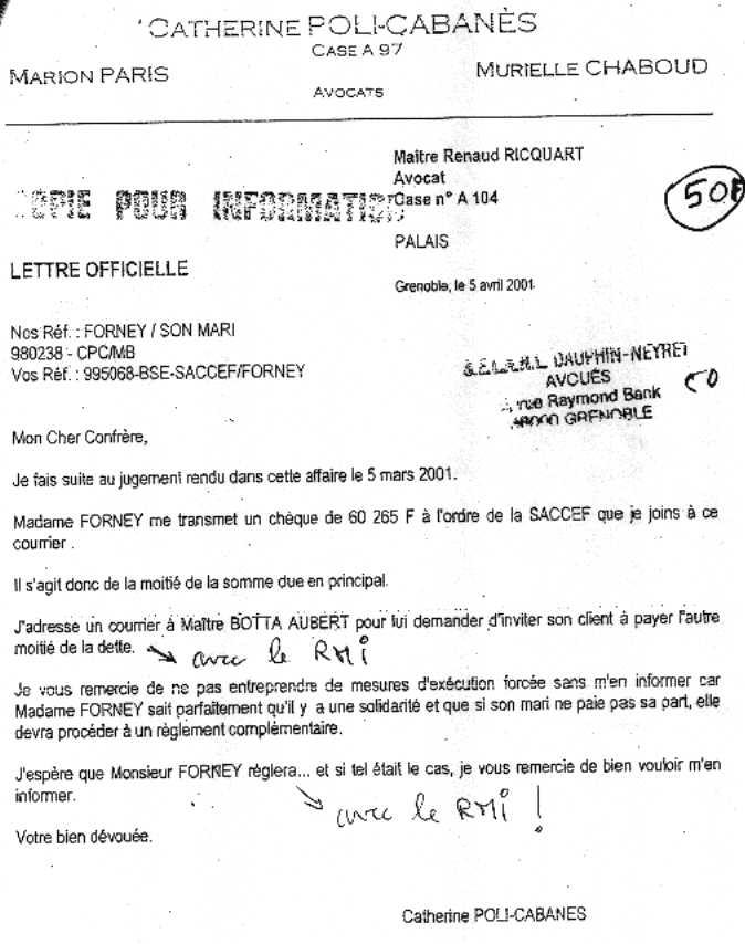Debit adverse de 60.265 fr (11.500€ en valeur 2017) par Mme RAYMOND Janine de la mairie d'Echirolles retraitée à Lansargues 34130. Paiement anticipé partiel sur les fonds recelés de la communauté concernant un emprunt immobilier. Poli-Cabanes une pro des procédures falsifiées et de l'entente avec les avocats adverses - Ici Besson-Mollard Laurence |