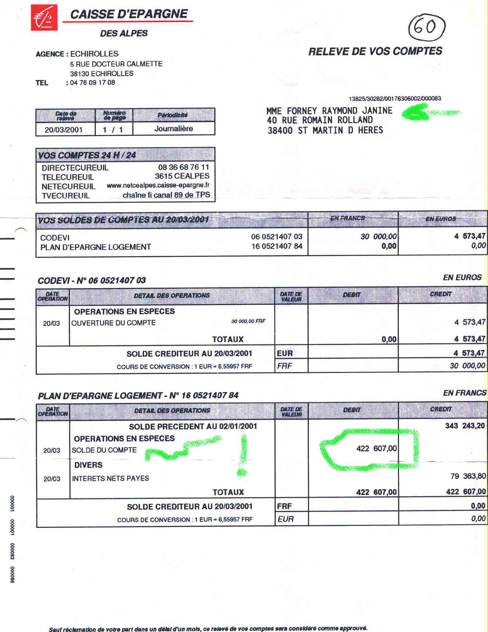 Ci-dessous volés à la communauté 422.607 Fr (96.614€ en valeur 2025 ) débités en espèces avant l'audience d'appel du 4/07/01 - juge DOUYSSET Michel. Voir aussi débits de 250 000, 00 et 60 000,00 Fr. sur le même semestre de 2001 = 144.000 € dépensés en six mois (!) alors que Mme RAYMOND Janine (née le 21 août 52) a déclaré détenir 50.000 € de la communauté ! ! (Recel de la communauté) |